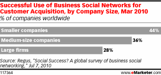 According to a February–March 2010 survey from office services firm Regus, smaller companies see the most success, with nearly half of small businesses around the world having acquired a customer through social networks. Large companies were less successful, but more than a quarter had seen social success through customer acquisition. This was despite large companies being more likely to devote budgets to social marketing.